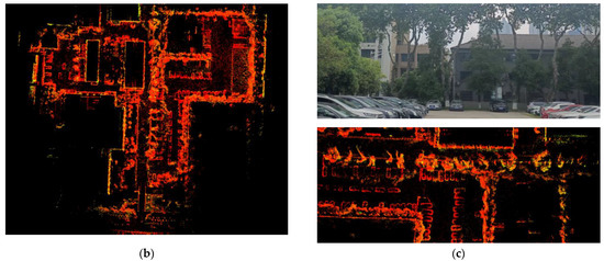 In the Figure 16a and Figure 17a, they show the corresponding trajectories of the two datasets and different colors represent the error values. In the Figure 16b and Figure 17b, the global reconstruction of the two scenes is built. Due to the multiple constraints of the back-end optimization, we obtain a globally consistent point cloud map. According to Equation (19), the robustness and reliability of the map can be guaranteed. The map shows the structural details in the bottom panel of Figure 16c. We can clearly see the cars and the trunk of the tree in the dataset in bird-eye view. In the Figure 17c, the wide roads have great influence for LIDAR slam (see Table 5). However, our algorithm can also reduce the error.