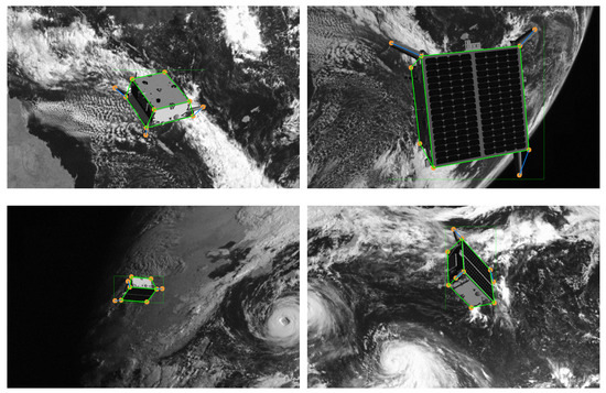 To obtain ground-truth landmarks of the Tango satellite in the image, we reproject the aforementioned set of reconstructed 3D landmarks to the image plane using the ground-truth camera pose. Since the convex hull of such reprojected 2D landmarks almost covers the whole target in any image, we slightly relax the horizontal rectangle which encloses all 2D landmarks, and take it as the ground-truth bounding box of the Tango satellite. Figure 7 shows several examples of obtained 2D landmark and bounding box labels.