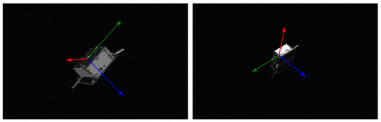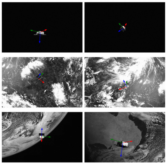 As shown in Table 1, we evaluate the performance of space target pose estimation that uses 2D landmarks predicted by our proposed space target landmark regression network. The evaluation metrics for space target pose estimation are composed as follows. is the average of the rotation errors for all space targets. is the average of the normalized translation errors for all space targets. E is the total error which is the sum of and . For each fold, all kinds of errors decrease as the input resolution increases. What is more, estimating spatial target pose using predicted landmarks described by the Gaussian kernel-based 1D landmark representation generally leads to a performance boost. Figure 9 shows qualitative results of space target pose estimation using predicted landmarks based on the Gaussian kernel-based 1D landmark representation under the input resolution condition of . The satellite body frame’s correspondence between colors and directions is red—x, green—y, and blue—z.