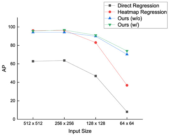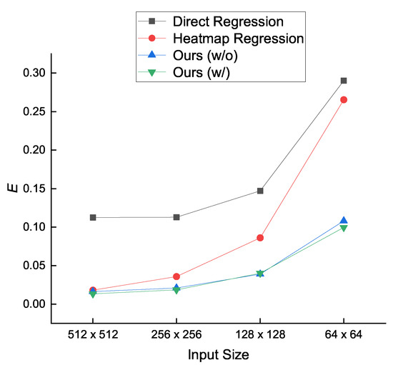 Figure 10 illustrates that our methods consistently provide significant gains for the performance of space target landmark regression, especially in low-resolution input conditions. Whereas, both the direct regression method [7] and the heatmap regression method [8] suffer from drastic performance drop as the input size degrades.