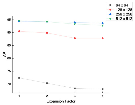 The expansion factor, , is the only hyperparameter in the 1D landmark representation, which controls the sub-pixel accuracy level of the landmark location. Specifically, the larger is, the lower the quantization error of 1D landmark representation is. Nevertheless, the increase in the expansion factor brings more computational burden to network training. Therefore, there is a trade-off between the quantization error and the network performance. We test in the 1D landmark representation without Gaussian kernel based on the proposed space target landmark regression network at various input resolutions. As shown in Figure 12, the performance of the proposed network tends to decrease as increases. For the input sizes of and , the best choice to is 1 so that the proposed network achieves the AP of 72.4 and 90.5, respectively. For the input sizes of and , the value of affects the network performance indistinctively. Specifically, the proposed network achieves the best AP of 94.4 and 94.6 when is set up as 1.