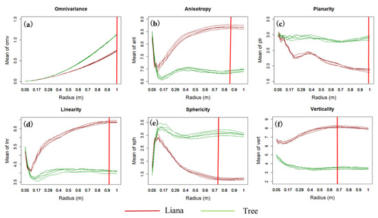 The changing trends of Omnivariance, Anisotropy, Planarity, Linearity, Sphericity and Verticality for Tree 2 across the various radii (y-axis indicates the mean value of each feature, and the x-axis shows the value of radius from 0.05 to 1 m; red line: liana; green line: Tree); red vertical line indicates the optimal radius used in this study (see Table 3).