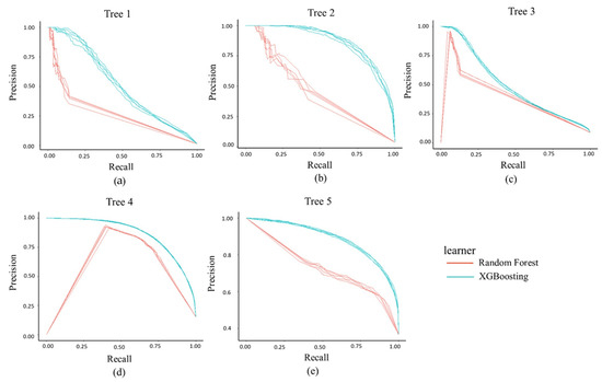 Precision–Recall areas of each evaluated tree based on Random Forest and XGBoosting algorithms. The red and blue colors indicate Random Forest and the XGBoosting model, respectively. The area under the Precision–Recall curve means the performance of the classifier.