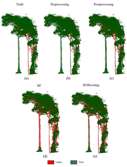 Figure 6 indicates the final predictions of different methods in Table 6 against independent data. It can be observed that RF (Figure 6d) and XGBoosting (Figure 6e) methods can also extract most lianas accurately, compared to the postprocessing method (Figure 6c). Although RF and XGBoosting methods misclassified some parts of the main trunk as lianas, this can be easily corrected by manual intervention, which can be seen from Figure 7.
