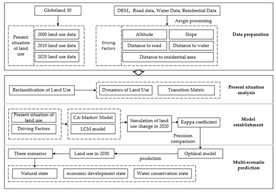 The technical pathway (Figure 2) mainly includes data preparation and simulation and prediction processes. The land use change over the past 20 years was analyzed based on the land use data from 2000, 2010, 2020. In the simulation process, the present land-use data and driving factors were entered into the CA-Markov and LCM models to simulate the land use in 2020. The Kappa coefficient was used to compare the simulation results in 2020 of the CA-Markov and LCM models and to select the optimal model for the study area, which was then used to predict the land use under three scenarios in 2030.