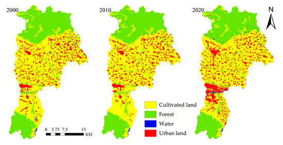 (1) From 2000 to 2020, the area of cultivated land first increased and then decreased; the area of forest continued to shrink but at a slower rate; and the water area first decreased and then increased. In contrast, the urban land expanded considerably, especially in the latter ten years from 2010 to 2020. This chaotic spatial distribution has severe negative implications for the landscape. Certain controlling measures are needed to limit the increase in construction land and improve the utilization rate of land resources;