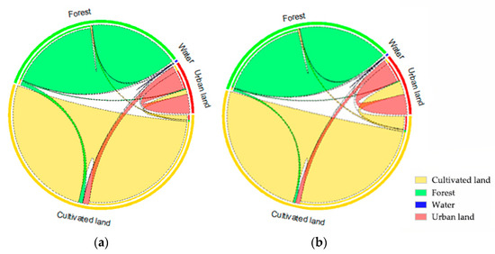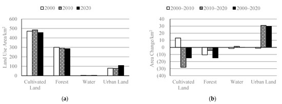 Furthermore, we observed mainly two types of large-scale conversion from 2010 to 2020: the conversion of 42.68 km2 of cultivated land into urban land and the conversion of 14.10 km2 of urban land into cultivated land. Compared with the first ten years, there are three main differences in the change in land area and land transition matrix in the last ten years. First, the status of urban land was reversed in the mutual transformation with cultivated land, where a large amount of cultivated land was converted into urban land. In the second set of 10 years, 42.68 km2 of cultivated land was converted into urban land, which was much greater than that in the first ten years. Second, the reduction in forest land slowed, also slowing down the conversion of forest to cultivated land from 13.18 to 5.85 km2. Third, water was restored, and the main conversion was from cultivated land and forest. In contrast to the changes in the first ten years, 0.9 km2 of cultivated land and 0.7 km2 of forest were restored to water.