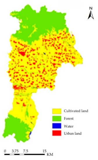 The original land use maps include seven types of land: cultivated land, woodland, grassland, shrubland, river, urban land, and wetland. Similar land types were combined to conduct an in-depth study on the land types with important characteristics in land use change in Qishan County. Among them, the grassland area is small, which is not a typical land type in Qishan County. Since these areas are mainly scattered sparse forest grassland and shrub grassland, we combined grassland into forest for analysis. The reclassification included four land types, i.e., cultivated land, forest, water, and urban land, as a foundation for subsequent analyses on the area change of land use and transitional type. Refer to Table 2 for details of the reclassification system of land use: