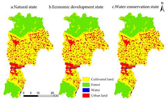 In this study, the land use classification of Qishan County in 2030 is predicted under three scenarios: natural state, economic development with expansion of urban land, and water conservation with restricted conversion. The results show that both cultivated land and forest are decreasing in any scenario and, especially considering the strong background of economic development, the area of cultivated land decreases more sharply and the urban land increases more rapidly compared with the area in the natural state. This urbanization process is related to the government’s long-term priority and focus on economic development and may have a series of negative impacts on human life and the environment [31,32]. Considering potential measures to restrict the encroachment of water, the water area increased by 45%, while other land use types were not affected, indicating that under the premise of not hampering economic development, restricting the conversion of water into other land use types can somehow protect the fragile water ecology.