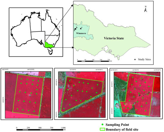 The experimental area is located in a relatively flat region in the Wimmera, western Victoria, Australia (Figure 1). It has a Mediterranean climate with significant climatic characteristics of dry summers and rainy winters. It is a semi-arid zone covering very large agricultural regions. The temperature typically ranges from 14 to 30 °C. Grains are the main crop of the region and they usually grow from May to late November. Lighter sandy and sandy loam soils are the main soil textures in the study area and the majority of soils are used to support agricultural productions.