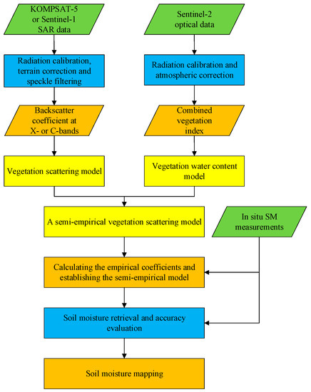 Overall procedure of soil moisture retrieval in the vegetated regions is based on remotely sensed SAR and optical data are illustrated in the flowchart of Figure 3. From the flowchart, the whole retrieval scheme is given as follows: