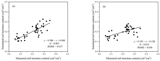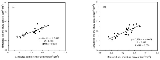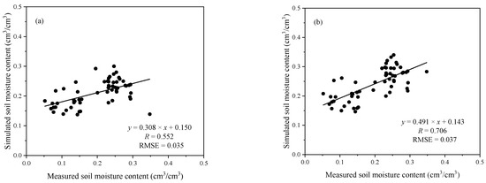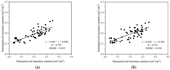 Scatter plot between the measured and simulated soil moisture at X- (a) and C-bands (b) extracted from soil moisture maps in Figure 7 (The units of RMSE is cm3/cm3).