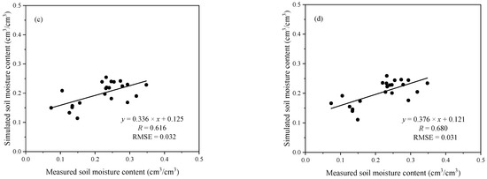Scatter plot between the measured and retrieved soil moisture at X- (a) and C-bands (c) using the semi-empirical model vs at X- (b) and C-bands (d) using Bao’s model based on validation data (The units of RMSE is cm3/cm3).