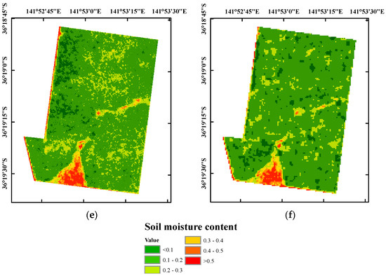As shown in Figure 7, the soil moisture maps at X- and C-bands are slightly different. Soil moisture varying from 0.05 to 0.30 cm3/cm3 indicates a slightly dry soil condition due to reduced rainfall in September. Actually, for Site c#, the X- and C-bands SAR overestimated the soil moisture in the middle of the southern parts, which can be explained because no measurements were conducted in this area to calibrate the proposed model. A small natural land with shrubs and riparian trees lies in the middle of southern region. A stream runs towards the northeast and remains dry for the whole year. In the southwestern region, the highest sand cover (70–75%) makes this region very dry. However, the maps at X- and C-bands in Figure 7e,f show relatively high values of soil moisture content in that region. This can be explained from two aspects: first, only small sampling points are distributed there, and the model cannot get sufficient information for the training; second, the proportional value of the sand used in the semi-empirical model is much lower than that in this region. In addition, soil texture, vegetation type and other ancillary information should be considered, and more investigation needs to follow to regionalize the model coefficients and improve the estimated accuracy of soil moisture in the future.