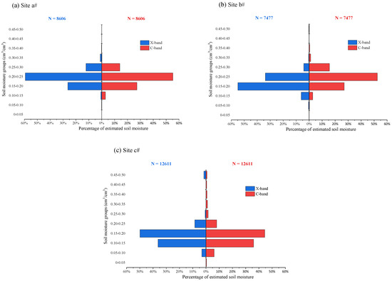 In order to evaluate the spatial distribution of soil moisture at X- and C-bands in the same resolution, the soil moisture maps from KOMPSAT-5 SAR data were resampled to 10 m, coinciding with that from Sentinel-1 data, over the three field sites. Meanwhile, the values of soil moisture with over 0.5 cm3/cm3 were eliminated so as to ensure the validity of soil moisture remote sensing monitoring. Figure 9 shows the pyramid plot of retrieved soil moisture at X- and C-bands with the same resolution of 10 m over the three field sites. The values of soil moisture were divided in 10 groups from 0 to 0.5 cm3/cm3 with the interval of 0.05 cm3/cm3. As can be seen from Figure 9, most of the soil moisture values are relatively compact and distributed between 0.20 and 0.25 cm3/cm3 at both X- and C-bands in Site a#, while the soil moisture is between 0.10 and 0.20 cm3/cm3 in Site c#. For Site b#, the soil moisture values at C-band are higher than that at X-band. The percentage of soil moisture values are distributed between 0.15 and 0.25 cm3/cm3. Overall, both X-band KOMPSAT-5 and C-band Sentinel-1 SAR data could be applicable for soil moisture retrieval based on the proposed model in vegetated regions.