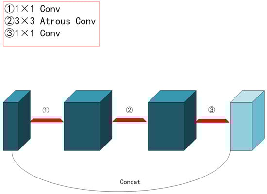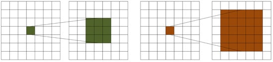Moreover, downsampling and larger convolutional kernels were two more conventional methods for enlarging the perceptual field. In the first scenario, downsampling frequently causes an image’s resolution to drop, obliterating some fine details and impairing our model’s ability to recognize the grass. As a result, this was a bad strategy for our grass detection model. In the second instance, increasing the convolutional kernel did broaden the perceptual field, as shown in Figure 2. However, depending on the size of the convolutional kernel, a feature point was replaced in the upper feature layer with a different number of feature points, meaning that the amount of information captured also varies. Naturally, a bigger convolutional kernel would have a more significant perceptual field, gathering more data and making it easier for us to distinguish the grass from other similar regions. However, a larger convolutional kernel also had drawbacks because it entailed more parameters, increasing program runtime. As a result, it was difficult to say if the gain from a larger kernel would outweigh the cost from more parameters.