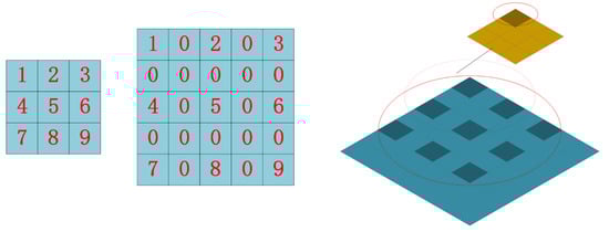 In conclusion, because the particular type of grass had more disturbances, we needed to use more detailed information to distinguish the grass from similar areas. However, the conventional method of expanding the perceptual field would simultaneously cause problems for our model; for this reason, we used the atrous convolution [27]. For segmentation models, when the use of downsampling results in the loss of detailed information and the use of larger convolution kernels results in more parameters, atrous convolution was a new concept to solve these problems. As seen in Figure 3, the original 3 × 3 convolution kernel had a hole added inside of it to increase the field of perception, giving it the same field of perception as a 5 × 5 convolution kernel with the same number of parameters and computational effort (dilated rate = 2), without the use of downsampling. When using atrous convolution, the convolution layer gained a new hyperparameter called the dilated rate, which determined how values were spaced when the convolution kernel processed the data. In this case, the dilated rate was 2. In reality, we added a 0 between each value in the 3 × 3 convolution kernel, separating the values from one another by the original nearby state. A 5 × 5 convolution kernel and the original 3 × 3 convolution shared the same field of perception in this way. It should be mentioned that the standard convolution kernel had a dilation rate of 1.