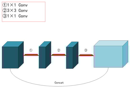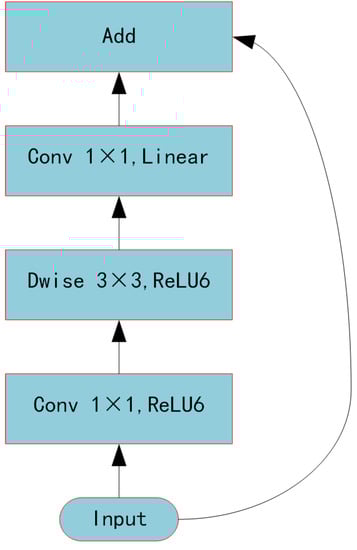 Furthermore, because the number of objects we need to recognize was not finite, we scaled down the backbone feature extraction network and replaced the standard Xception network structure [28] with the lighter mobilnetV2 network structure [29], which further cut down on training time. Explaining the residual and inverse residual structures was required before introducing the mobilnetV2 network topology. According to the traditional residual structure depicted in Figure 4, the initial input was downscaled using a 1 × 1 convolution. Next, features were extracted using a 3 × 3 convolution, upscaled using a 1 × 1 convolution, and finally, the output was produced by splicing the newly created feature layer with the original input. The inverted residual structure in mobilnetV2 used a 1 × 1 convolution to up-dimension the original input, followed by a 3 × 3 deep separable convolutions to extract features, and then a 1 × 1 convolution to downscale. Applying the inverse residual structure would lead to a structure with two tiny ends and a large middle, as seen in Figure 5, as opposed to the original residual structure, which would generate a structure with two large ends and a small middle. Therefore, the essence of the inverted residual structure was why we must first perform the dimensionality increase and then the dimensionality decrease. It goes without saying that if we reduced dimensionality first and subsequently raised it, the 3 × 3 convolution in the middle would require less work. The more computationally costly forms of up-dimensioning and down-dimensioning were used in the mobilnetV2 network topology to enhance feature extraction and produce more valuable features. Deep, separable convolution drastically reduced the number of parameters compared to conventional convolution, ensuring that our computation was not excessively massive even after dimensionality. A single inverse residual structure could not possibly encapsulate the benefits of mobilnetV2, and numerous enhancements were not discussed in this paper. Nevertheless, as seen in Figure 6, the network structure of mobilnetV2 comprises numerous inverse residual structures that were sequentially connected. The mobilnetV2 network was unquestionably lighter than the original Xception network structure utilized in Deeplabv3+, and it significantly increased our training speed.