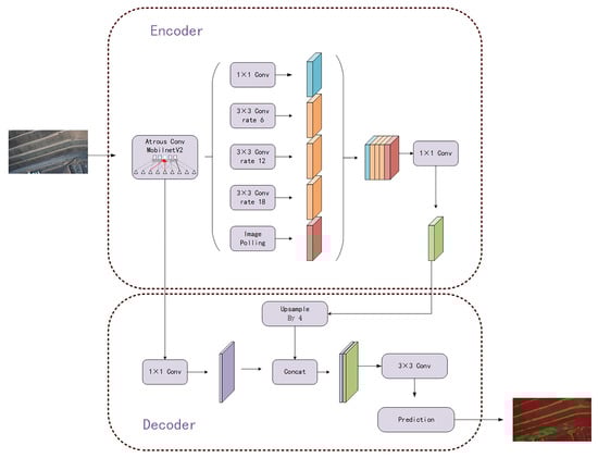 The DeepLabv3+ model [30] had been hailed as a new high point in the evolution of semantic segmentation models. It balanced high- and low-level features extracted by the backbone feature extraction network using atrous convolution, leading to a final feature map that retains the greatest range of feature information, while losing the least amount of detail information. As was noted in the preceding section, the backbone feature extraction portion of the Deeplabv3+ method’s original network structure was Xception. Here, we carried out a large number of experiments and discovered that due to the particularity of the task of grass recognition, when the network structure was too deep and too large, it would increase the recognition effect of the grass, but the overfitting problem would occur. Therefore, we used the mobilnetV2 and the Xception network structure in practice to get almost the same accuracy. However, because the training period for mobilnetV2 was substantially lower than for Xception, we ultimately decided to use mobilnetV2 as our leading feature extraction network. Figure 7 displays our model for segmenting grass. The first stage of encoding and feature extraction and the second stage of decoding and prediction make up the overall network structure. We uniformly resized all training data to 512 × 512 before introducing it into the grass segmentation model. After that, the training data were introduced into the network. (After the backbone feature extraction stage, we retained the original input data results that have been twice and four times compressed.) We convolved the initial adequate feature layers compressed four times with various scales of atrous convolution kernels to generate the feature layers, and then we connected these feature layers, which we refer to as X1. And X1 was then downscaled using the 1 × 1 convolution kernel. The network then moved to the decoding stage. We first utilized 1 × 1 convolution to modify the number of channels of the twice-compressed feature layer generated during the coding stage, which we refer to as X2. Then, in order for the size of the upsampled X1 to match that of X2, we set the up-sampling ratio to 4. The final effective feature layer X was created by stitching the up-sampled X1 and X2 together, and finally, we convolved the X with two atrous convolutions.