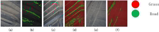Demonstration of the effect of the algorithm proposed in the paper on various types of grass, (a) pictures of mining areas with less grassland, (b) the effect of the algorithm proposed in the paper on (a,c) pictures of moderate grassland mining areas, (d) the effect of the algorithm proposed in the paper on (c,e) pictures of mining areas with more grassland, (f) the effect of the alforithm proposed in the paper on (e).