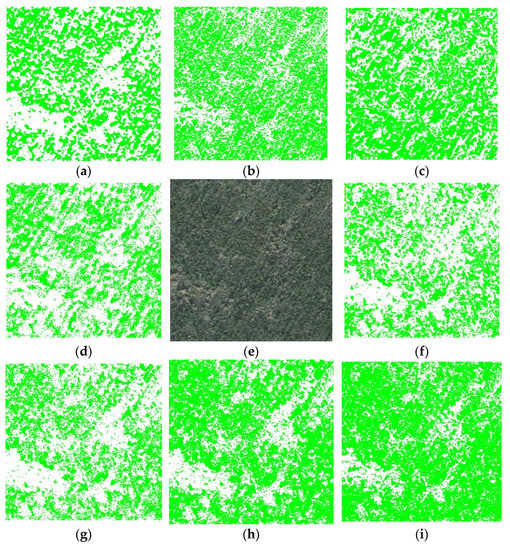 Comparison of the results of the vegetation extraction in Sample Site A, with vegetation in green. (a) EXG, (b) EXGR, (c) k-mean, (d) NGBDI, (e) RGB, (f) NGRDI, (g) VDVI, (h) truth, (i) svm.