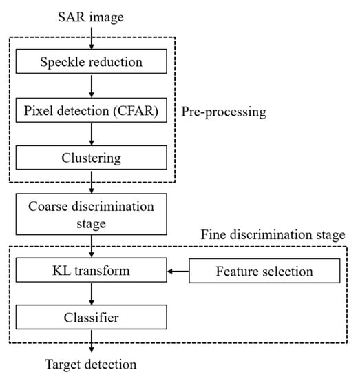 In this study, we propose a two-stage detection framework to ensure efficient and high detection performance in TSX images. We analyzed the performance of the features for distinguishing targets and clutter in TerraSAR-X (TSX) images and selected those features suitable for target discrimination. Moreover, we propose an efficient two-stage target discrimination scheme for clustered pixels in TSX images. In the proposed scheme, speckle reduction, based on the Lee filter, and pixel detection, based on FT-CFAR, are performed a priori, followed by building clusters of targets using the DBSCAN algorithm in the SAR image. Although the SAR image is designed, there are many clusters owing to the false alarms related to the remaining speckles, background noise, and clutter. Subsequently, a discrimination stage was required to reduce the number of false alarms. The proposed discrimination stage consists of two sequential steps: a coarse discrimination step (CDS) and a fine discrimination step (FDS). The CDS quickly finds the desired clusters corresponding to the targets of interest and results in reducing the majority of the false-alarm clusters. Then, FDS is performed only against those clusters that passed the CDS based on the selected features with good discrimination performance. In FDS, feature generation based on the Karhunen–Loève (KL) transform is adopted to maximize the discriminatory performance in the feature space [15].