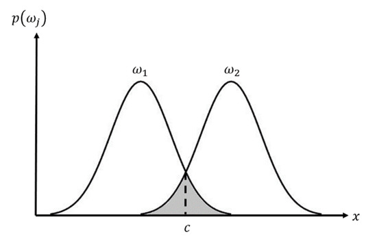 where is the feature value of class j, and c is a feature value in which the probabilities of the two distributions are equal.