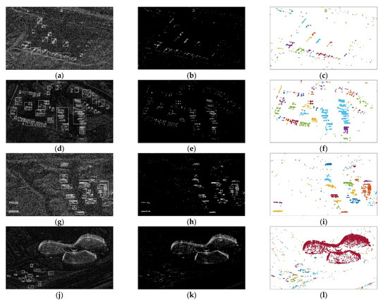 Original SAR images and their corresponding detection and clustering results: (a,d,g,j) original SAR images and ground truths (white boxes) of the targets; (b,e,h,k) despeckling and pixel detection results using Lee filter and FT-CFAR; (c,f,i,l) clustering results using DBSCAN.