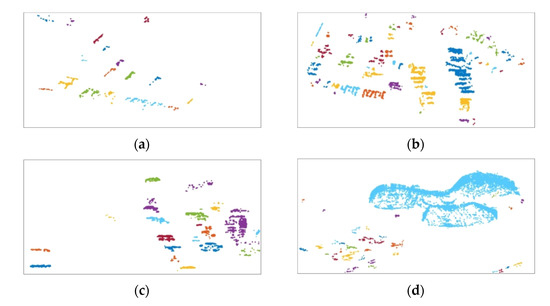 Results after the coarse discrimination step. Each cluster is indicated by a different color. (a) Scene 1; (b) Scene 2; (c) Scene 3; (d) Scene 4.