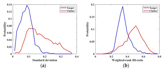 To select the features that are effective in distinguishing the target from clutter, the separation performance of the features was evaluated based on the training data. The values of all features were extracted for each chip of the training data, and the distributions of targets and clutters for each feature were obtained using a normalized histogram. Figure 6 shows the distributions of standard deviation and weighted-rank fill-ratio as an example. In addition, for all features, the area overlapping the distributions of the target and clutter, l, was measured (Table 2). It is considered that the feature with a lower overlapping area, l, has better separation performance, and features with l less than 0.6 were selected based on Table 2. As a result, seven features (standard deviation, weighed-rank fill-ratio, max CFAR, mean CFAR, ADP, SDP, and STDDP) were available for target-clutter discrimination.