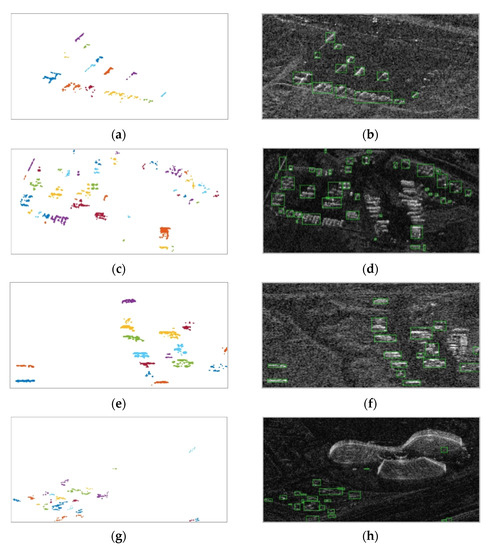 Results of target discrimination and subsequent target detection results for SAR Scenes 1 to 4. (a,c,e,g) Target discrimination results. Each discriminated cluster is indicated by a different color. (b,d,f,h) Target detection results based on discrimination results in the original SAR image Detected targets are indicated by green boxes.