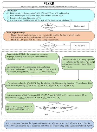 In this study, the VISRR algorithm was implemented based on the precalculated LUTs, which were built by the second simulation of a satellite signal in the solar spectrum vector (6SV) radiative transfer (RT) model [73]. The input parameters of the 6SV RT model included the SRFs of DPC 443, 490, 670, and 865 nm; six combinations of fine-mode aerosols and coarse-mode aerosols, as shown in Section 3.3.3; and ranging from 0 to 80 with an interval of 6; ranging from 0 to 180 with an interval of 12; 11 AOD values (550 nm)—0, 0.01, 0.25, 0.5, 1, 1.5, 2, 2.5, 3, 4, 5; and elevation set to sea level. Then, atmospheric parameters (i.e., , , , , and in Equation (4)) for various observational and atmospheric scenarios were built in the LUTs. Similarly, the LUTs of CWV and O3 gas transmission were also built by the 6SV RT model. The value of CWV was set in the range of 0 to 7 g/cm2 with an interval of 0.5, and the value of O3 was set in the range of 0 to 5 cm-atm with an interval of 0.5. In this study, the prior knowledge of BRDF shape (Equation (3)) was assumed to be unchanged for one month and independent of bands [62,65]. When the LUTs and related auxiliary data were ready, the VISRR algorithm could be performed based on the multiangle multispectral DPC intensity data. All procedures were applied to the individual pixels, and the output result at each pixel was recorded. The schematic flowchart is shown in Figure 5, and the specific retrieval steps are described below.