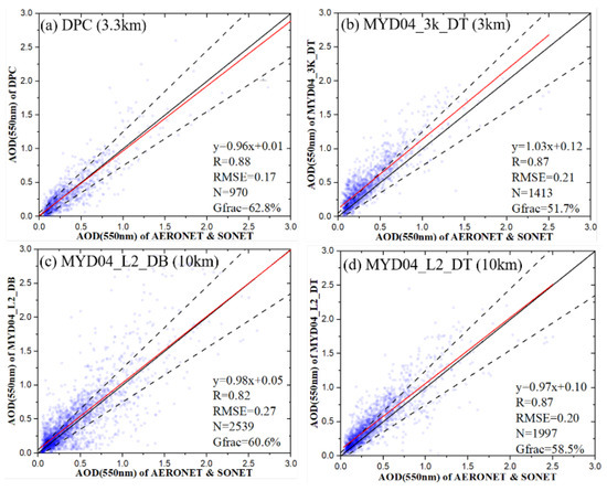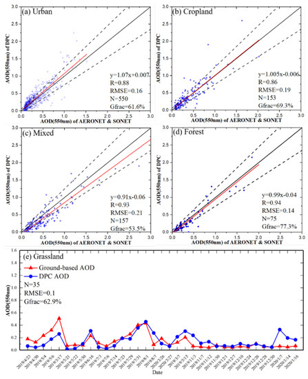 The authors would like to express our gratitude to AOE Baotou, Beijing, Beijing PKU, XiangHe and Taipei CWB AERONET sites for ground-based data. The authors would also like to thank the Chinese National Space Administration Earth Observation and Data Center for providing the DPC/GF-5 data, NASA for providing the MODIS products data, and USGS for providing the GMTED2010 and Splib07b datasets. The authors deeply appreciate the detailed comments and valuable suggestions from the anonymous reviewers.