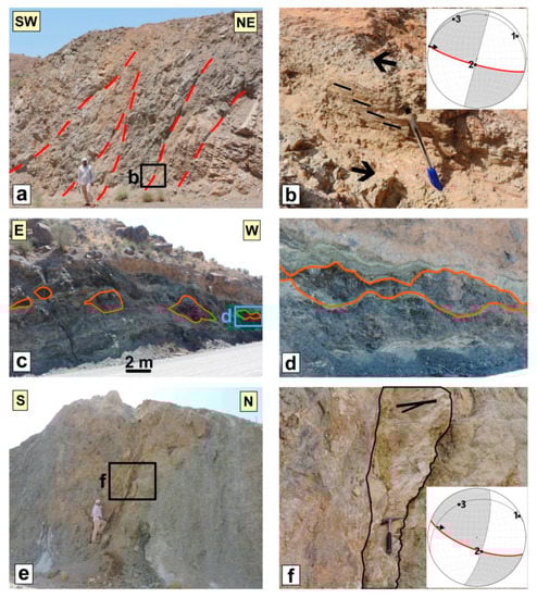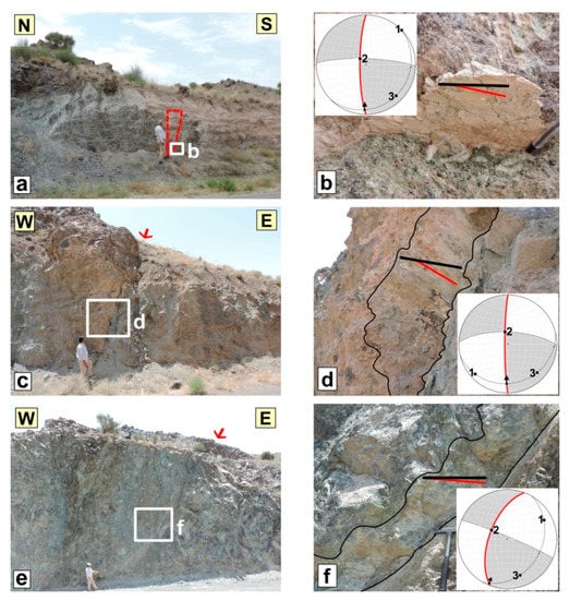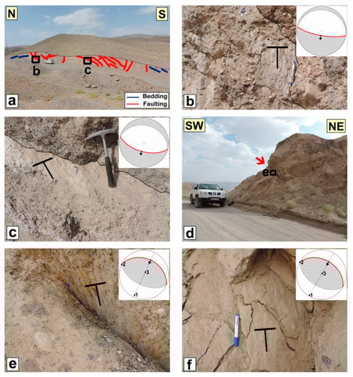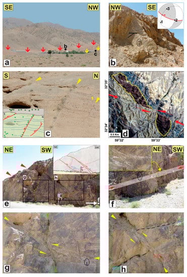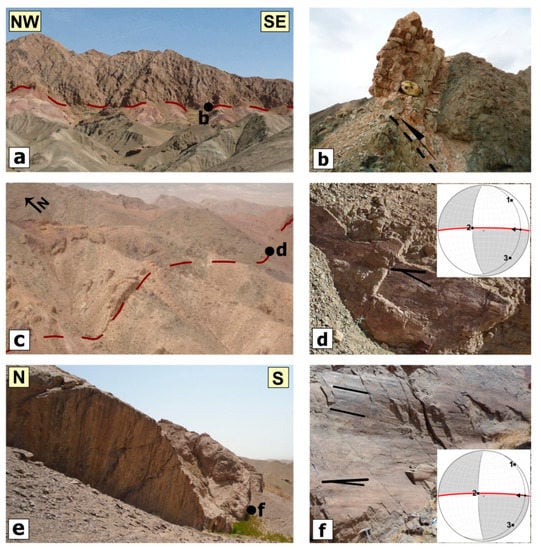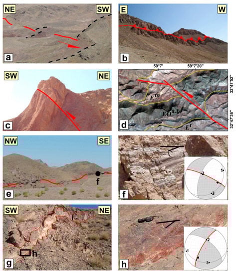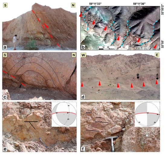 The Shekarab fault, at ~30 km long and with an E-W strike, is situated in the northern front of the Shekarab range (Figure 1c and Figure 10). In the west, the fault incised the Eocene basaltic andesites and tuffs, while in the east it follows the contact of Eocene basaltic andesites to the south and Cretaceous ophiolithic mélanges to the north []. On the satellite images, the easternmost fault strand could be detected within the Birjand plain, while its western continuation is not well traceable (Figure 1c). The Quaternary geomorphic features such as stream offsets and fault scarps could be considered as recent Shekarab fault activity. The youngest fault kinematic indicators suggest its recent oblique left-lateral reverse motion (e.g., Figure 11d–f).