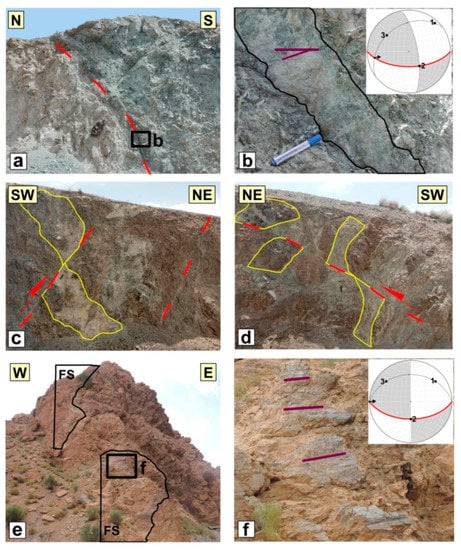 The Boushad fault, with a length of ~40 km, has played an important role in shearing and facilitating alteration processes within the Bagheran range. The Boushad fault separates the Cretaceous ophiolitic mélange and the Tertiary volcano-sedimentary rocks. The Boushad fault can be divided into the eastern NW-SE and the western E-W fault segments. The trace of the fault in its westernmost termination is not traceable, while its eastern segment obviously connects to the Fanud fault (Figure 1d). Although the western segment (N90°E, 90°) did not show any specific kinematic indicator, the eastern segment (N70°E, 70°SW; 285°/14°) could be considered as an oblique left-lateral reverse fault (Figure 6e,f).