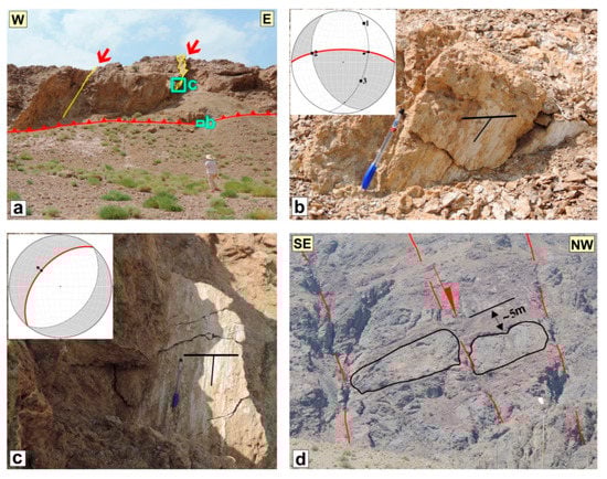The Gol fault is situated in the intensely deformed southern front of the Bagheran range. This fault with a WNW-ESE strike and ~45 km length follows the overall trend of fold axial traces. The Gol fault consists of several segments with different lengths and strikes. In general, it could be divided into the two main east and west segments (Figure 1d). The Quaternary alluvials, young terraces, and gravel fans are folded and displaced along the fault []. Along the west segment, fault scarps with clear striations are recorded between the Cretaceous flysch to the north and the Quaternary alluvials to the south. Geometric and kinematic characteristics of the fault planes (N90°E, 70°N; 068°/46°) show a reverse mechanism with a left-lateral strike-slip component for the western segment (Figure 8a,b). On the hanging-wall of this segment, a set of normal faults (N40°E, 50°NW; 310°/50°) is observed. The normal faults with similar direction are also mapped in the northern front of the Bagheran range. For example, in the southwest of Birjand city (see F.8d on the Figure 5a), a normal displacement of ~5 m is recorded across the fault (Figure 8d).