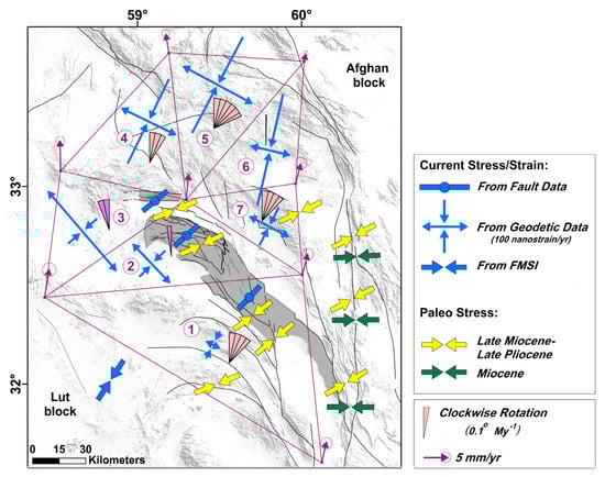 - Jentzer, M.; Fournier, M.; Agard, P.; Omrani, J.; Khatib, M.M.; Whitechurch, H. Neogene to Present paleostress field in Eastern Iran (Sistan belt) and implications for regional geodynamics: Paleostress Field in Eastern Iran. Tectonics 2017, 36, 321–339. [Google Scholar] [CrossRef]