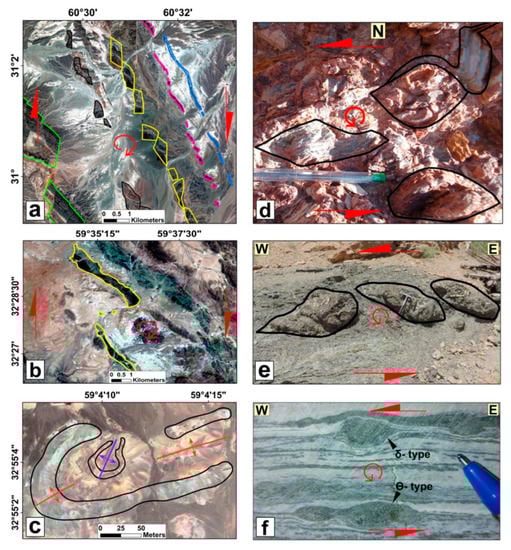 - Nozaem, R.; Mohajjel, M.; Rossetti, F.; Della Seta, M.; Vignaroli, G.; Yassaghi, A.; Salvini, F.; Eliassi, M. Post-Neogene right-lateral strike–slip tectonics at the north-western edge of the Lut Block (Kuh-e–Sarhangi Fault), Central Iran. Tectonophysics 2013, 589, 220–233. [Google Scholar] [CrossRef]
