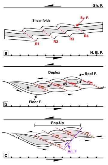 - Boyer, S.E.; Mitra, G. Fold duplexes. J. Struct. Geol. 2018, 125, 202–212. [Google Scholar] [CrossRef]