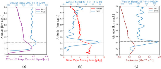 Wavelet Signal (Blue lines) from 14 April 2017 02:00 UTC, for (a) 532 nm Near Field channel Range Corrected Signal (purple line) from PollyXT Lidar, (b) Water Vapor Mixing Ratio (red line) from PollyXT Lidar and (c) Attenuated Backscatter Coefficient (brown line) from Halo Lidar.
