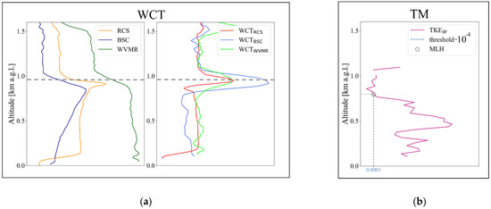 The methods used in this study in order to retrieve PBL height, present similarities, and differences. WCT detects a strong decrease of the signal of a parameter, while TM detects the first value that overpasses the threshold set by the user. The systematic differences that may arise during inter-comparison of the methods in this study, are attributed to the different parameters on which each method is applied. WCT is used for the detection of PBL height, using aerosols (RCS, BSC, WVMR) as tracers, while TM is used for the detection of PBLH, using a thermodynamic parameter (TKEdr) as tracer. In Figure 3, profiles of products are presented, along with the method used, for 10 April 2017, 01:30 UTC. As observed, WCT captures a layer around 950 m, but TM detects the first point that is lower than the threshold at 790 m approximately. This difference is attributed to the scientific parameter that is used as an indicator for the PBL or MLH height.
