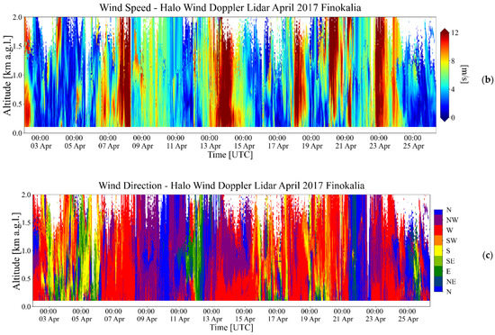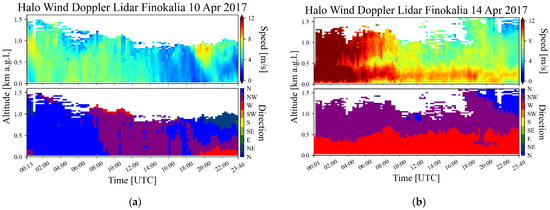 Before analyzing statistics of PBL height at Finokalia during the PreTECT Campaign, two days are presented with different meteorological conditions and aerosol mixtures. Firstly, 10 April 2017 is described by the presence of clouds and aerosols and secondly, 14 April 2017, is a day without clouds and significant aerosol load. In Figure 4, wind conditions are illustrated. For the first case, mostly N/NW moderate winds are dominant (Figure 4a) in addition to the second case, where W winds are present up to 600 m, turning to NW above (Figure 4b). The main wind flow in Finokalia is from the North, considering that it is an island in the south Aegean Sea, affected by the Etesians. The presence of Crete Island functions as an obstacle and shifts the wind to NW and W near the surface.