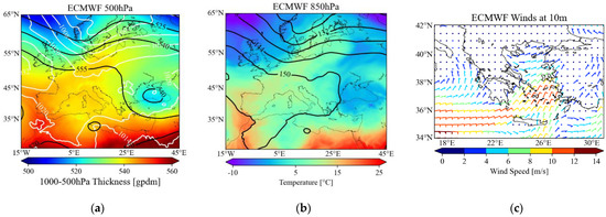 As a result, the weather in Crete, Greece is characterized by low temperatures, favoring cloud formation. The wind field in the Aegean Sea is mostly N/NE, stronger in the central and southern parts reaching up to 12 m/s (6 Beaufort-fresh to a strong breeze, Figure 5c).