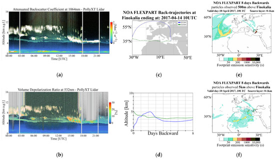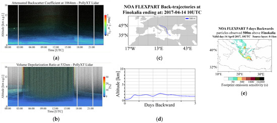 (a,b) PollyXT Lidar parameters for 14 April 2017 00:00–24:00 UTC: Attenuated Backscatter Coefficient at 1064 nm channel in arbitrary units (a.u.); Volume Depolarization Ratio in percentage units, (c,d) Air mass backward trajectories, based on FLEXPART simulations, ending at 500 m above the Finokalia station on 14 April 2017 at 10:00 UTC; Altitudes, above ground level, of the air masses on their route prior their arrival over the ground station, (e) FLEXPART Source Receptor Relationships (s) for air masses originating from 0–1 km a.s.l. arriving above Finokalia at 500 m on 14 April 2017, 10:00 UTC.