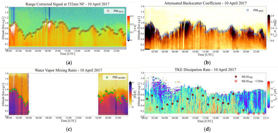 PollyXT Lidar (a,c) and Halo Wind Doppler Lidar (b,d) products for 10 April 2017: (a) Range Corrected Signal (RCS) at 532 nm NF channel (Grey color at the bottom of the Figure, identifies the incomplete overlap of PollyXT Lidar)—Brown circles: PBL height from Wavelet Covariance Transform (WCT) on RCS (PBLRCS); (b) Attenuated Backscatter Coefficient (BSC)—Blue circles: PBL height from WCT on BSC (PBLBSC); (c) Water Vapor Mixing Ratio (WVMR)—Green Triangles: PBL height from WCT on WVMR (PBLWVMR); (d) Turbulent Kinetic Energy dissipation rate (TKEdr)—Red stars: Mixing Layer Height (MLH) from Threshold Method (TM) on TKEdr (MLHTKE).