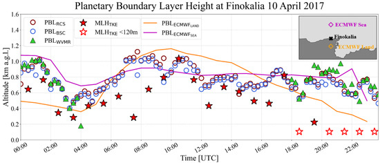 10 April 2017 PBL height diurnal evolution from WCT applied on 532 nm NF RCS (brown circles—PBLRCS), WVMR from PollyXT Lidar (green triangles—PBLWVMR), BSC from Halo Lidar (blue circles—PBLBSC) and TM applied on TKEdr from Halo Lidar (red stars—MLHTKE). Top right: map with Finokalia’s location between ECMWF Land bin (orange diamond) and ECMWF Sea bin (purple diamond).