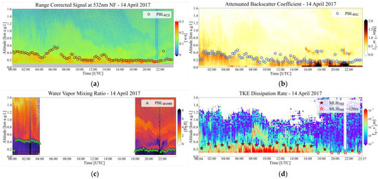 PollyXT Lidar (a,c) and Halo Wind Doppler Lidar (b,d) products for 14 April 2017: (a) Range Corrected Signal (RCS) at 532 nm NF channel (Grey color at the bottom of the Figure, identifies the incomplete overlap of PollyXT Lidar)—Brown circles: PBL height from Wavelet Covariance Transform (WCT) on RCS (PBLRCS); (b) Attenuated Backscatter Coefficient (BSC)—Blue circles: PBL height from WCT on BSC (PBLBSC); (c) Water Vapor Mixing Ratio (WVMR)—Green Triangles: PBL height from WCT on WVMR (PBLWVMR); (d) Turbulent Kinetic Energy dissipation rate (TKEdr)—Red stars: Mixing Layer (MLH) Height from Threshold Method (TM) on TKEdr (MLHTKE).