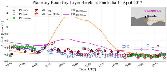14 April 2017 PBL height diurnal evolution from WCT applied on 532nm NF RCS (brown circles—PBLRCS), WVMR from PollyXT Lidar (green triangles—PBLWVMR), BSC from Halo Lidar (blue circles—PBLBSC) and TM applied on TKEdr from Halo Lidar (red stars—MLHTKE). Top right: map with Finokalia’s location between ECMWF Land bin (orange diamond) and ECMWF Sea bin (purple diamond).