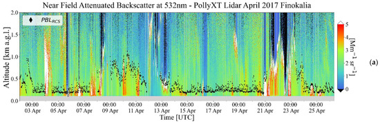 An overview of wind speed and direction during 1–26 April at Finokalia, is presented in Figure 13b,c, indicating variable meteorological conditions and aerosol transportation. In Figure 13a, the attenuated backscatter coefficient at 532 nm is displayed, along with the PBLRCS. White parts of the plot, signify the presence of low clouds, and black parts stand for the attenuated signal above clouds. Time periods with low-level clouds were excluded from PBL retrievals. No sharp daytime evolution of PBL is observed and its height varies between 200 and 1000 m approximately. It is also shown that when N or NW winds are present over a wide portion of the vertical profile (1–3, 9–12 April), PBL is higher. W winds in the lower levels, favor a shallower PBL, (6–8, 13–16 April) and winds from the eastern and southern sectors, favor the cloud formation (3–6, 12, 21–23 April).