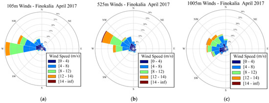 Wind Rose from Halo Wind Doppler Lidar during 1–26 April 2017 for (a) 105 m level, (b) 525 m level and (c) 1005 m level above ground.